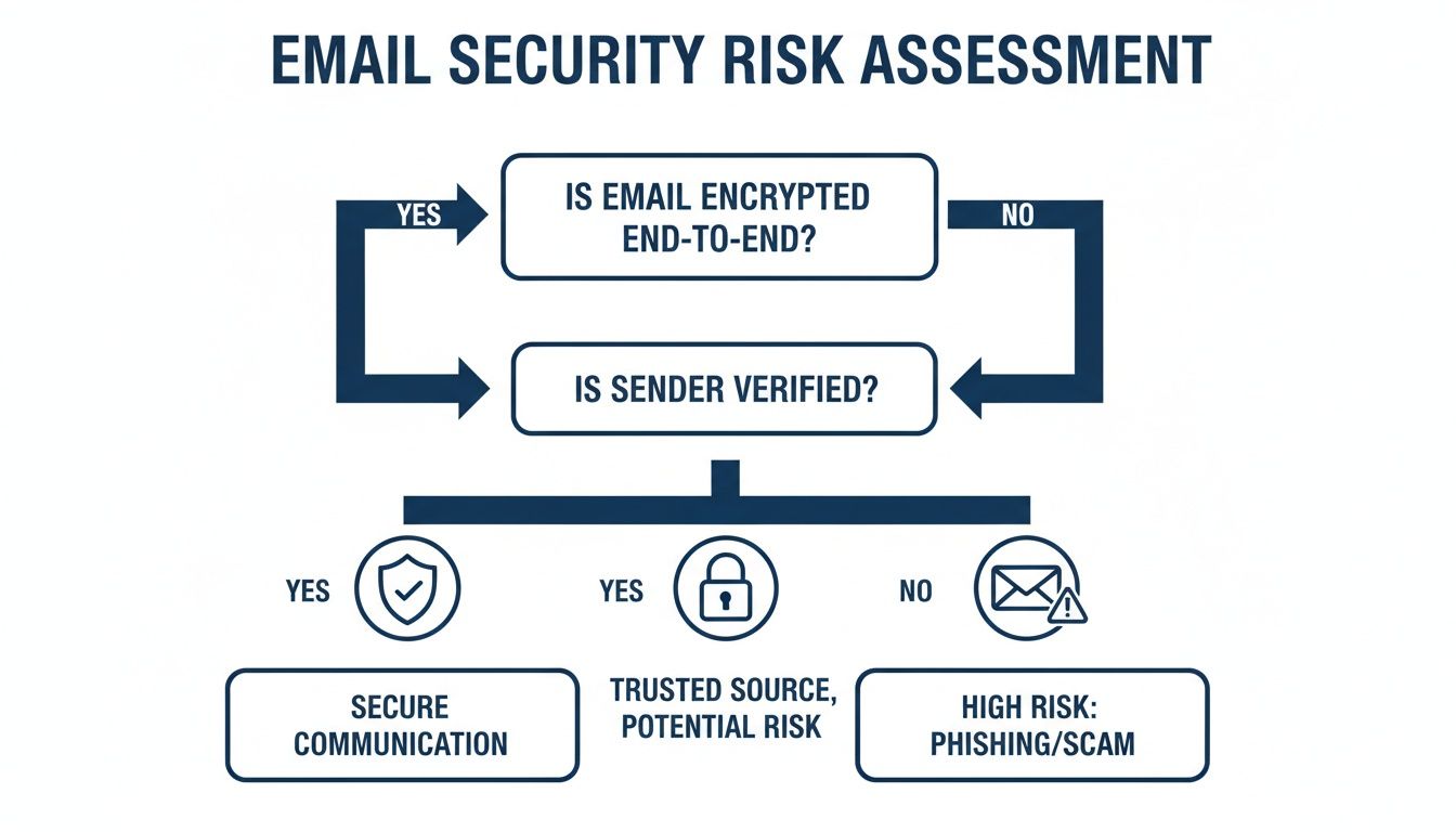 - End-to-End Encryption: This is the bedrock. Encryption scrambles your message so that only the intended recipient can unscramble and read it. Standard email is like sending a postcard—anyone who handles it can read it. End-to-end encryption turns that postcard into a locked briefcase, ensuring not even the service provider can see what's inside. For firms dealing with sensitive data like medical records, this is a core requirement. For more on this, our guide on HIPAA compliant email solutions is a great resource.
